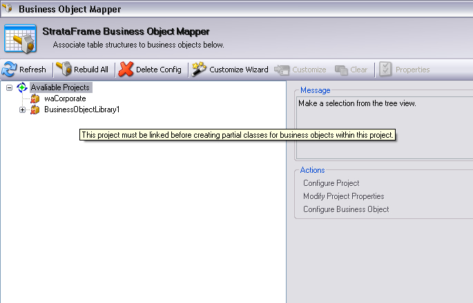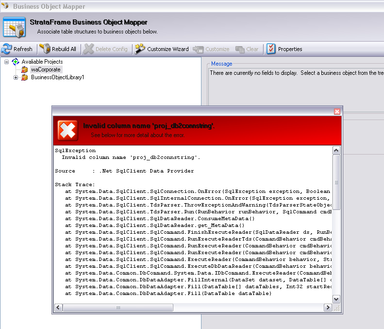 Criei um projeto usando StrataFrame WindowsApplication, neste projeto adicionei um StrataFrame BusinessObjectLibrary. Abro o Business Object Mapper para configurar esse Business Object mas quando clico em "Configure" em um item do "Available Projects" aparece uma mensagem de erro.