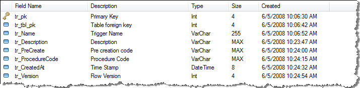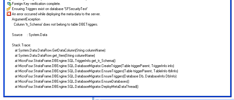 You can see the structure above. I would recommend either download the install again and trying again (as I know that this is a solid build) or even trying the 1.6.7 beta. This sounds like your DatabaseDTK.exe file is not being overridden which could be a permissions issue. If you go into VS and click on the StrataFrame -> Version menu, it will show which EXE version you are running. Also, you can see the structure for the DBETriggers table above. So you have one or the other or both out of sync somehow.