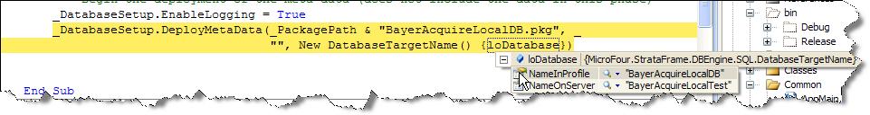 See attached image showing that when I step on the DeployMetaData you see my NameOnServer is definitely different but it doesn't have any effect. Hmmmm... Maybe I need to try stepping into Strataframe code now that I know how to do this! But let me know if you see anything funny about my code. The only special stuff is that I validate the connection to the server and extract the actual server instance name from the existing connection, but I can't see how that could mess up what's in the databasemigrator.