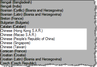 Do you know what the Microsoft locale ID is for these languages when used in windows? We need to make sure we have the languages you will be translating to loaded on our development machines before we begin the process. I've attatched a screenshot showing the chinese languages installed by default in windows. Do GB and Big-5 correspond to languages in this list? Or do we need to load a chinese language pack from microsoft to have access to the needed languages?