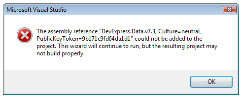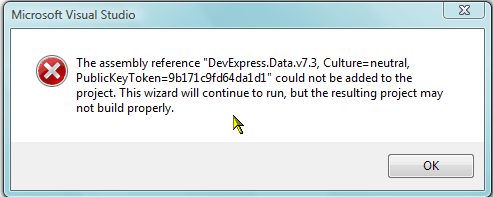 "The assemblies reference "DevExpress.Data.v7.3 ... could not be added to the project."