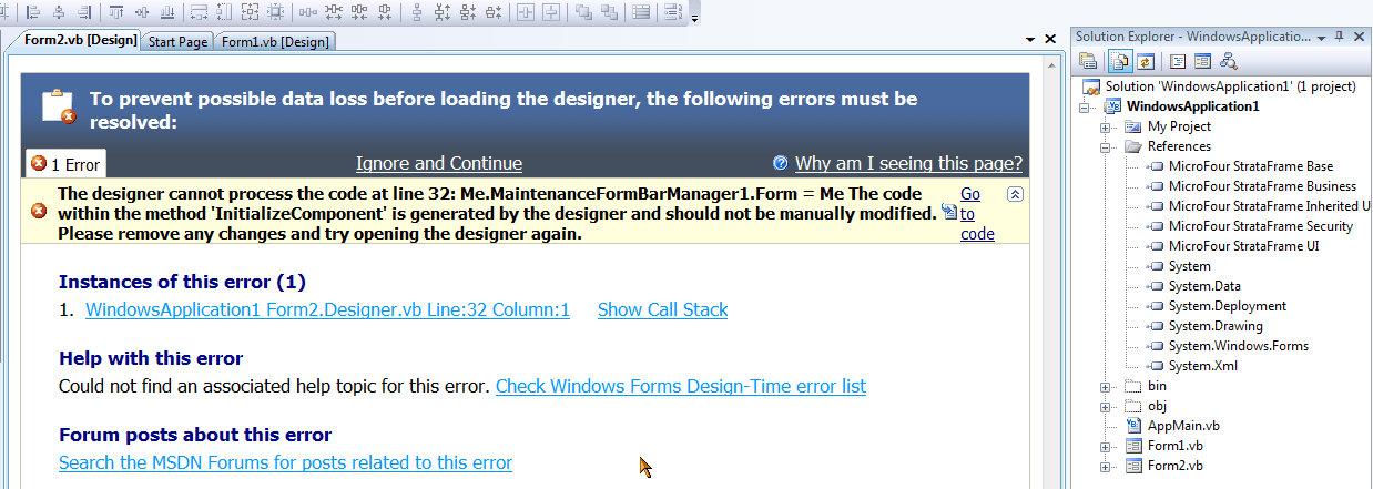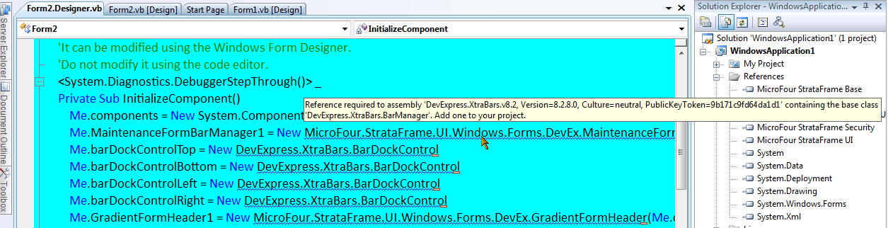 Error 1 Invalid Resx file. The located assembly's manifest definition does not match the assembly reference. (Exception from HRESULT: 0x80131040) Line 183, position 5. C:\Program Files (x86)\MicroFour\StrataFrame Source Code\MicroFour StrataFrame Inherited UI\DevExpress Extended\Dialogs\browsedialogwindow.resx 183 5 MicroFour StrataFrame Inherited UI