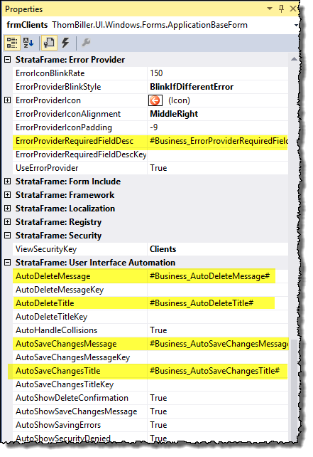 Hi Larry, I don't use the MaintenanceFormToolStrip class in my application, but I see some of what is being explained in this thread in the form's property sheet as seen in the attached image. Like you said, the compiled application just works by resolving these constant but they are not resolved in the IDE whey they used to show up properly a while ago.