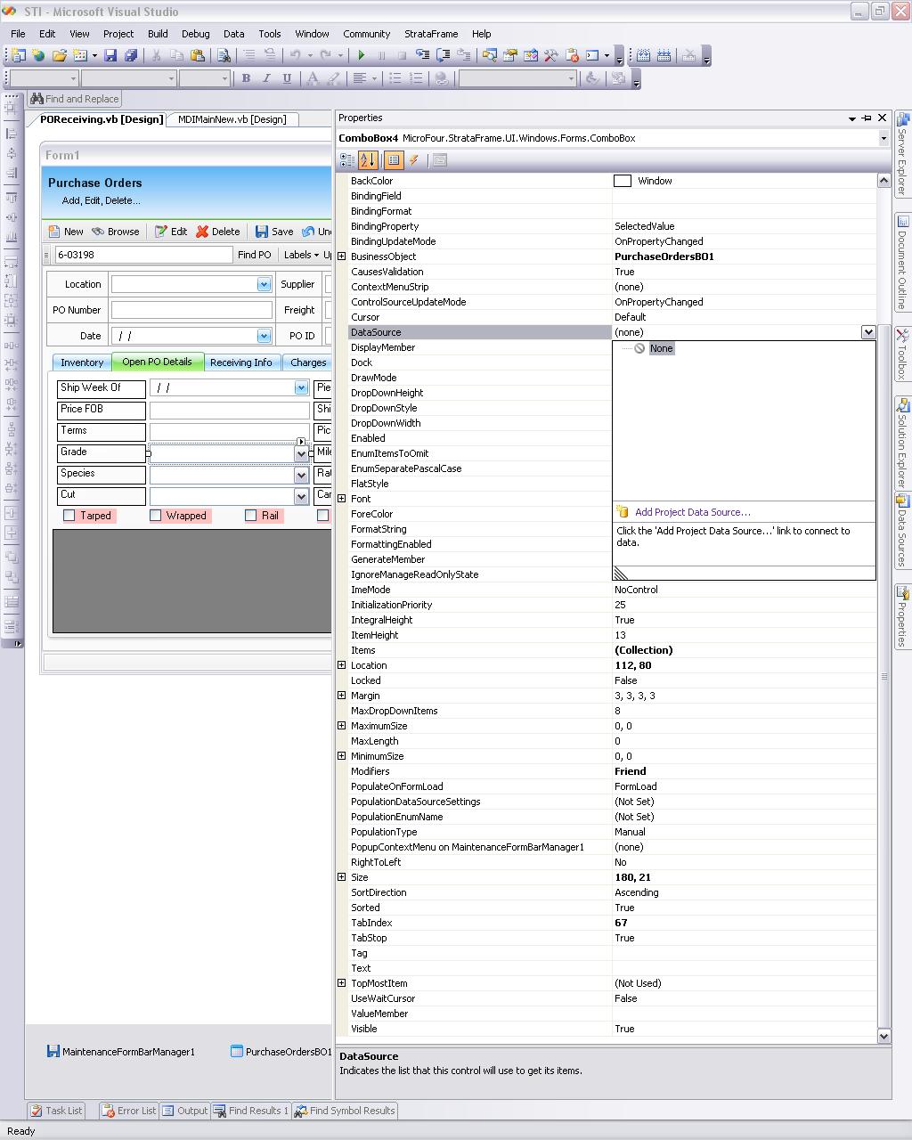 I noticed some strange behavior on a form that I had already created that WAS working fine  and then when I went to run it yesterday its not working properly. The one thing I noticed was that the Business objects that I had created on this form (or any form after i had done a little investigation) weren't showing up in the datasources property anymore. The screen shot below will illustrate that. Any ideas why this is happening?