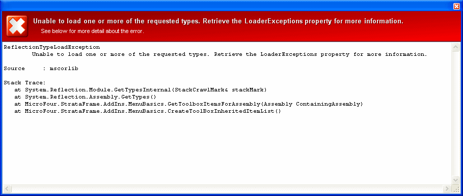 I got this error when building my Stataframe Toolbox Tab. This was after installing the released 1.5 version. When we were working with the pre-release version of 1.5, I lost my toolbox tab when I closed Visual Studio and had to rebuild it each time. I also received this error then.