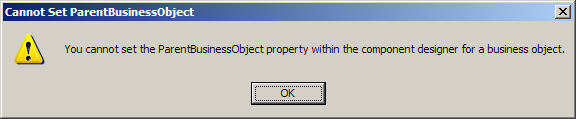 I'm confused. The first error was the result of trying to "configure the parent relationship a single time in the component designer for the business object (at the class level)". I was not trying to set to an instance, nor did I even get the chance. The error appeared the instant that I clicked on the dropdown error at the right side of the ParentBusinessObject. It says "You cannot set the ParentBusinessObject property within the component designer for a business object".