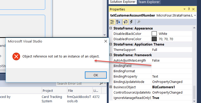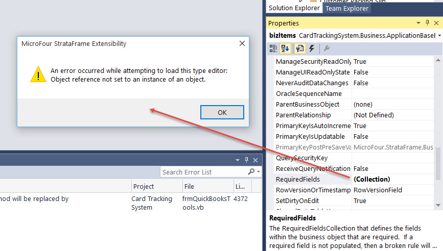 Hi Ben, I am getting some errors when trying to select a BindingField from the list in a text field, also when trying to access a BO.RequiredFields collection. Error: "Object reference not set to an instance of an object:" I am using the following: VS2015 Enterprise .Net 4.6 VB.NET Also, so you know since I installed the VISX in VS2013, I opened another solution in VS2013 and the Type Editors are working fine, so the issue is with VS2015.