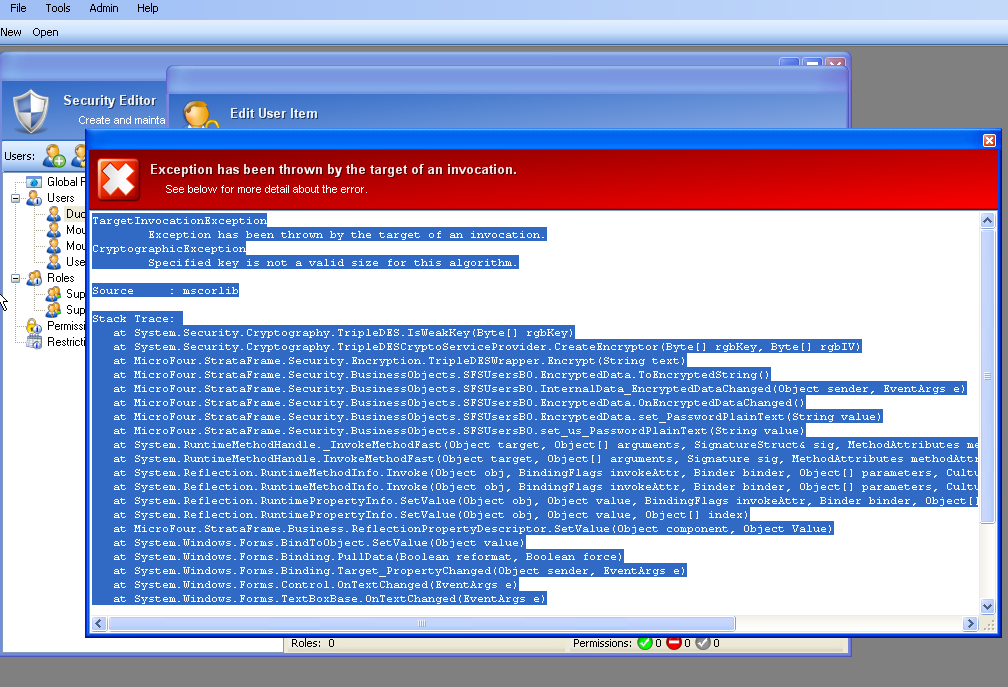 I'm getting an error when running Security Manager from within my application, see attached. The security tables are contained within my application database and I deployed the security data from my project using the Database Deployment Toolkit. When I run Security Manager the user data appears to be successfully populated by the toolkit with the exception of the passwords which appear to be blank. When I try to type something in the password field, the error is returned. I get the same error if I try to add a new user.