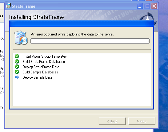 That solved it - turns out that my restore program copied an old backup of the StrataFrame.mdf. When the new install tried to create it an error occurred. Enhancement request for future would include easy access to the log file when an install fails.
