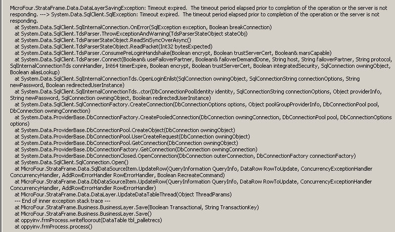 Hey Keith, it looks as though the error is just manifesting itself through the Save....but the actual error is happening on the backend through the connection in the DAL.  The error is actually happening within the System.Data.SqlClient.TdsParserStateObject.ReadSniSyncOverAsync method.  It seems that one of two things could be happening: